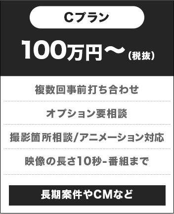 カンヌ金賞受賞のクリエイター、大手CMディレクター、某テレビ番組ディレクターなどが在籍しており、ハイクオリティーの動画が非常に得意です。